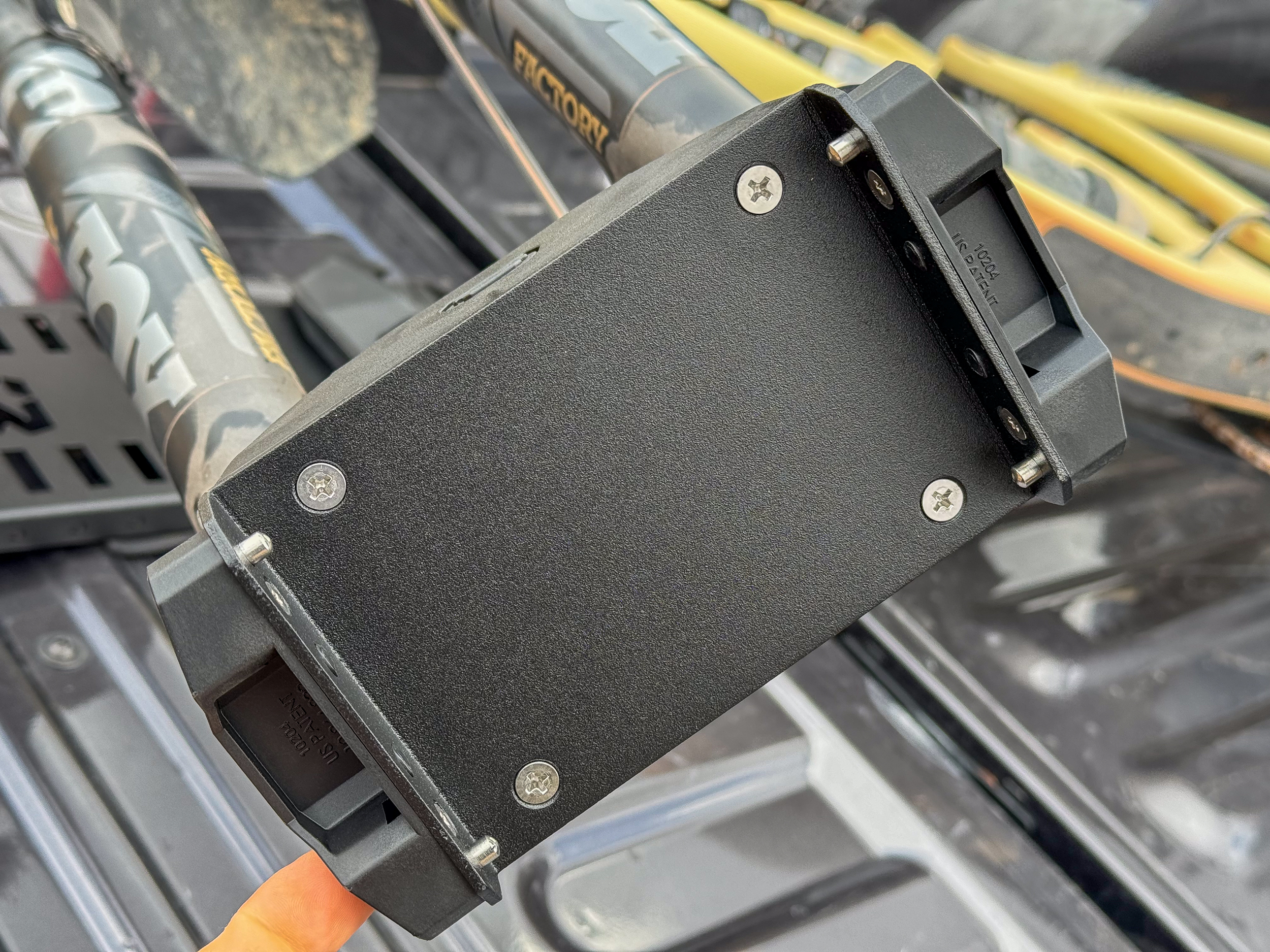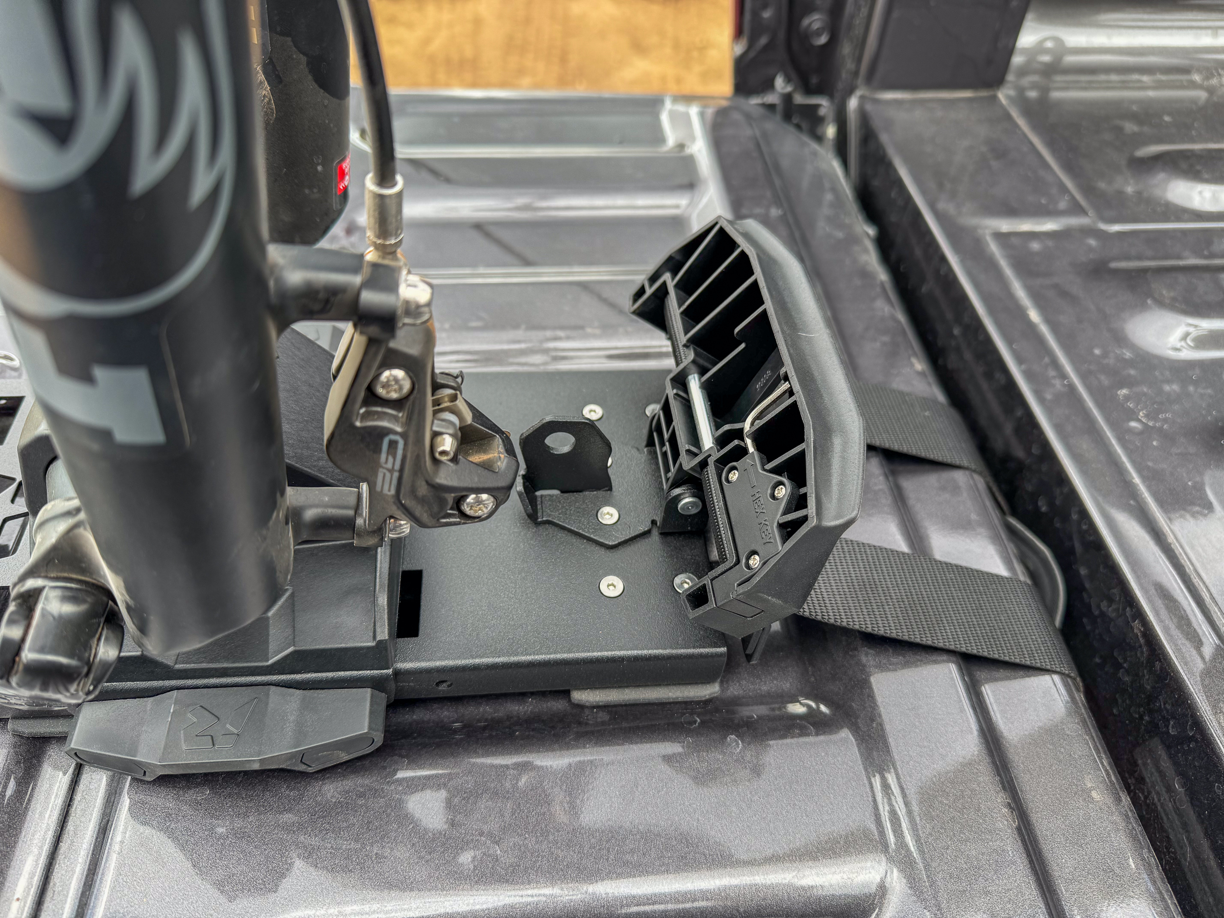 El soporte para horquilla también viene con inserciones para adaptarse a cinco tamaños de horquilla diferentes, incluidos 9 x 100 QR, 12 x 100 TA, 15 x 100 TA, 15 x 110 Enhance TA y 20 x 110 Enhance. Los adaptadores se cambian fácilmente con solo presionar un botón en el soporte de horquilla. El sistema de portaequipajes para puerta trasera incluye todo lo necesario para montar el portaequipajes en la puerta trasera de su camión, además de dos Bricks para guardarlo en casa (o en otros vehículos).