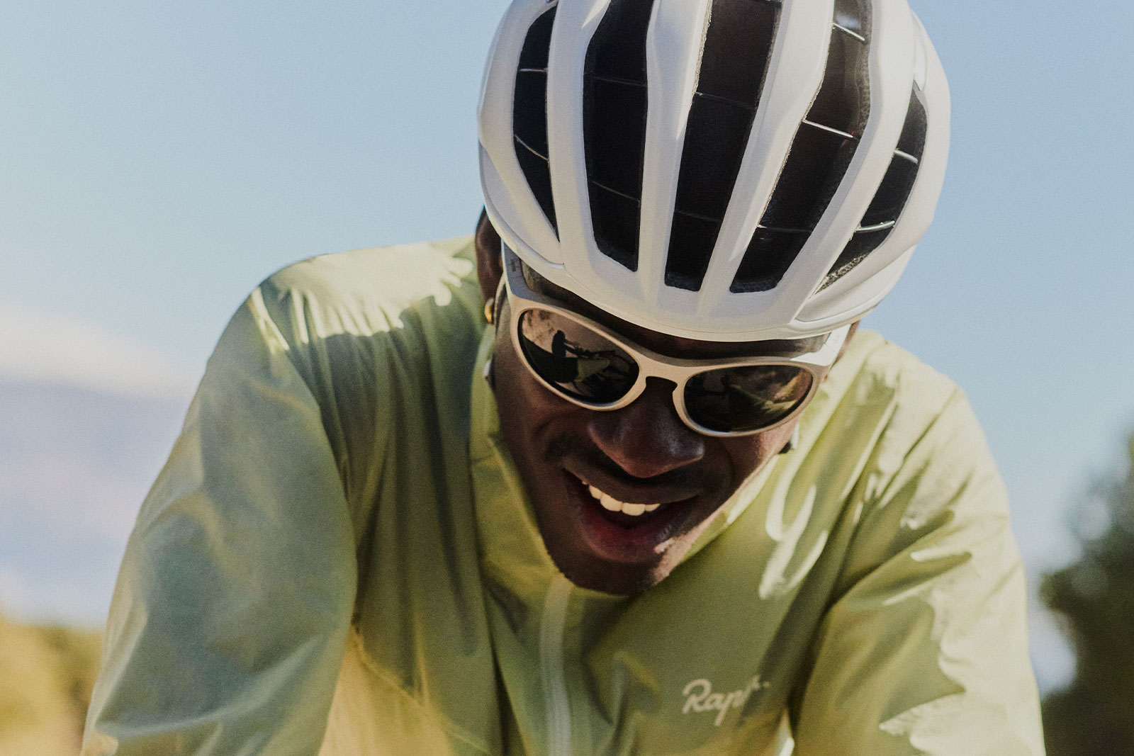 “Gafas de ciclismo ligeras y sin montura con tecnología de lentes Rapha de alto contraste. Escudo de forma libre diseñado para ver y viajar más lejos“
