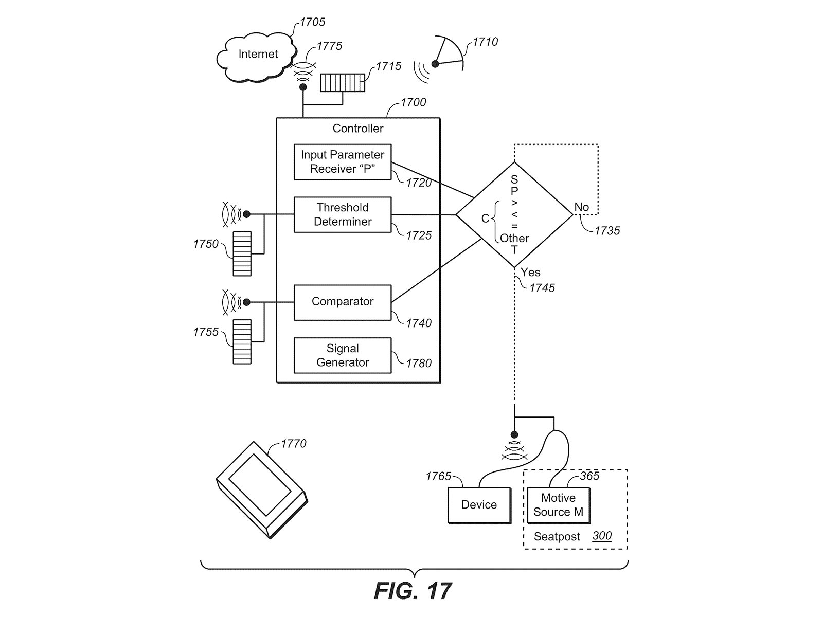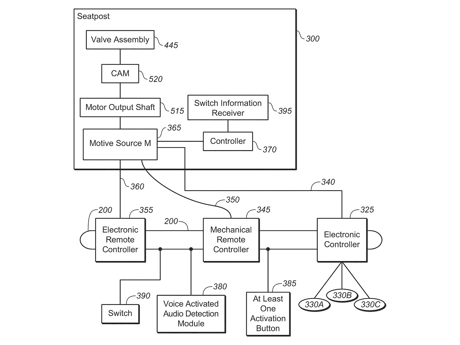 “…el poste del asiento es accionado por un controlador diseñado para recibir y analizar la entrada asociada con la frecuencia cardíaca de un ciclista, así como las coordenadas GPS del ciclista. Por ejemplo, si el controlador recibe una entrada que describe que la frecuencia cardíaca del ciclista es inferior a un umbral preprogramado dado mientras conduce, entonces el controlador puede indicar al poste del asiento que se mueva hacia arriba o hacia abajo, lo que hace que el ritmo de trabajo y la frecuencia cardíaca del ciclista aumenten o disminuyan. En otro ejemplo, si el controlador recibe una entrada que describe que las coordenadas GPS del ciclista son tales que el ciclista está a punto de llegar a un terreno que tiene un descenso pronunciado, el controlador puede hacer que el poste del asiento baje en preparación para el descenso.